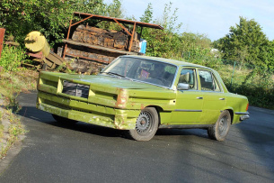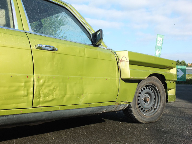 Wer diesen Mercedes-Benz 450 SE Baujahr 1978 zum ersten Mal erblickt, reibt sich ungläubig die Augen: Ein citrusgrün-metallic farbenes Ungetüm, dessen Front von grob angeschweißten Leitplanken geformt wird. Nicht elegant, nicht repräsentativ, sondern kompromisslos crash- und kampfbereit. Dieser Benz sieht nicht nur auf den ersten Blick außergewöhnlich aus, sondern auf jeden weiteren auch. Und das hat einen besonderen Grund.